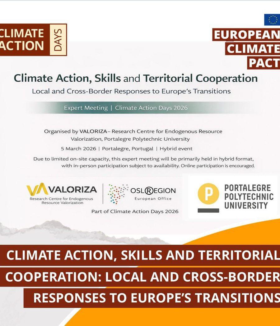 A iniciativa, organizada pelo VALORIZA – Centro de Investigação para a Valorização de Recursos Endógenos do Politécnico de Portalegre, decorre a 5 de março, na BioBIP – Business Incubator of Portalegre, reunindo investigadores, decisores políticos, educadores e representantes institucionais para debater o reforço da ação climática através da qualificação e requalificação de competências, bem como da cooperação territorial e transfronteiriça.